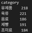 식품 카테고리 df['category'].unique() : 육류, 유제품, 음료, 제빵, 조미료