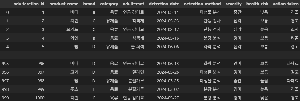 검출 불순물 df['adulterant'].unique() : 인공 감미료, 착색제, 물 희석, 멜라민, 분필가루