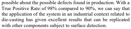 실제로 실제 산업 생산라인에 검사 시스템을 통합하여 하이브리드 자동차용 알루미늄 부품의 가공면과 비가공면에서 표면 결함 인라인 검사를 수행하였을 때 기존 전반적 산업 수준인 90%에서 TPR이 98%까지 상승할 수 있었다는 보고서를 통해 결함 측정 검사를 개선하는 것만으로도 불필요한 비용 낭비를 감소시킬 수 있는 효과를 얻을 수 있다는 고찰을 얻었다.