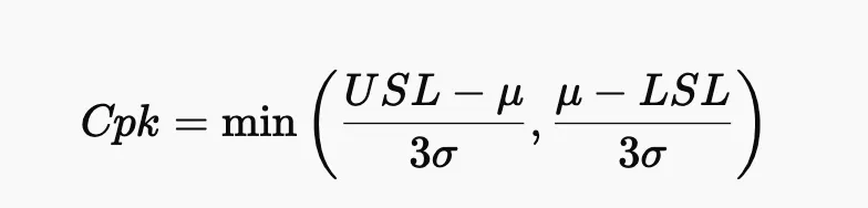 - Cpk는 실제 공정 평균이 허용 기준 내에서 얼마나 중앙에 위치해 있는지를 반영. 공정의 평균이 중심에서 얼마나 치우쳐 있는지 고려