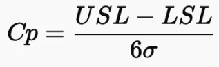 공정 능력 지수(CP, Process Capability Index): 공정이 주어진 *공차 내에서 얼마나 일관되게 생산되는지를 수치로 표